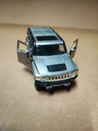 Réplica detallada de un coche miniatura tipo Hummer H3 en color gris. - Puertas y techo solar abatibles. - Rueda de repuesto en la parte trasera. - Diseño fiel al modelo real.