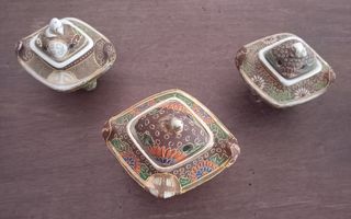 3 incendiarios japoneses pintados aa mano. REGALO jarrón japonés a juego. Medidas incenciario: - Grande, 12cm x 11cm. - Pequeños, 11cm x 9cm. - Jarrón, 9cm x 6cm.