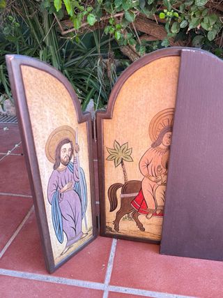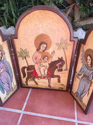 Triptico decorativo con un diseño único. - De madera pintado - Ilustración detallada en tonos tierra.