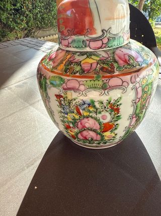 Precioso jarrón de estilo chino con una detallada decoración. - Diseño floral y de figuras. - Colores vivos y vibrantes. - Tapa a juego.