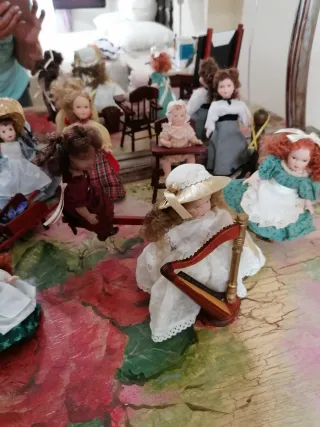 Conjunto de delicadas muñecas de porcelana, perfectas para coleccionistas. - Muñecas de porcelana con vestimenta detallada. - Incluye un escenario con mapa y pupitre.