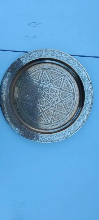 Precioso plato decorativo de latón con un diseño árabe intrincado. Ideal para añadir un toque de elegancia a cualquier espacio. - Material: Latón. - Diseño: Estrellas y motivos geométricos. - Borde decorado.