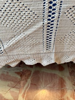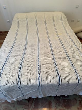 Colcha de crochet hecha a mano con un bonito diseño. - Diseño de rombos y rayas verticales. - Acabado con volantes en el borde.