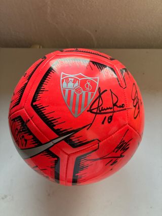 Balón de fútbol del Sevilla FC de la temporada 2015/2016, firmado por varios jugadores. - Diseño oficial del equipo. - Firmas de jugadores de la plantilla de la temporada 15/16.