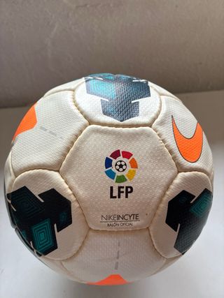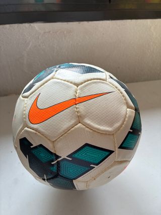 Balón oficial de la Liga de fútbol temporada 2013/2014. - Diseño con paneles. - Logo de Nike. - Colores blanco, naranja y verde azulado.