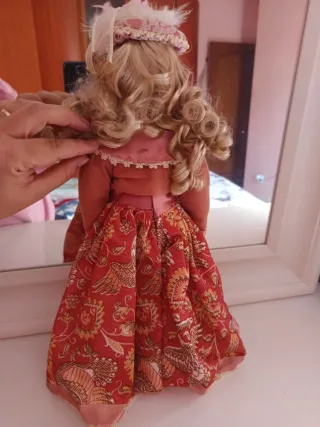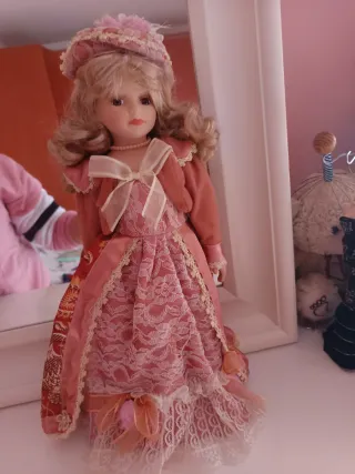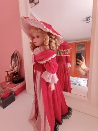 Preciosa muñeca de porcelana con un vestido de época. - Detalles en encaje y lazo. - Incluye sombrero a juego. - Adorno de perlas en el cuello. Los zapatitos tienen una pequeña mancha de pegamento (de fábrica)