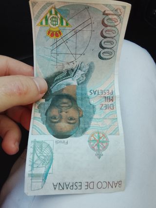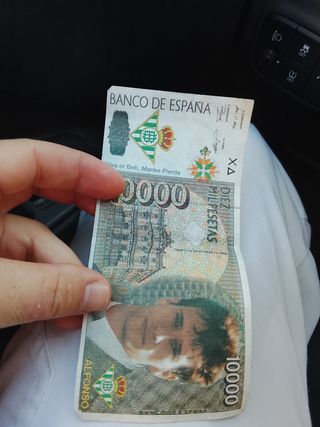 Billete de 10000 pesetas de España. Se vende billete personalizado de 10.000 pesetas con diseño artístico único: incluye retrato de Finidi George, emblemático jugador del Real Betis, junto al escudo del club y elementos geométricos de estilo matemático. > > Ideal para coleccionistas de fútbol, aficionados del Betis o amantes de piezas curiosas y creativas. > > Estado: excelente conservación. > > No es billete oficial del Banco de España, sino una edición artística con valor simbólico y decorativo. > > Precio negociable. Se - Diseño con retrato y elementos gráficos.