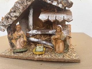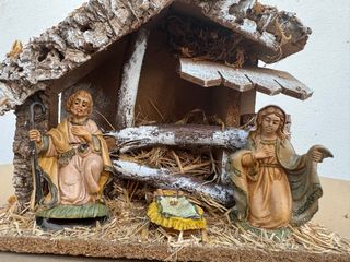 Conjunto de belén con figuras para decorar tu hogar en Navidad. Incluye las figuras principales. - Figuras de San José, la Virgen María y el Niño Jesús. - Portal de belén con estructura de madera y corcho. - Material de las figuras: resina.