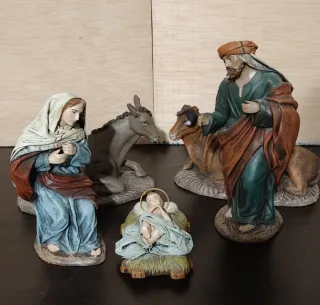 Conjunto de figuras para Belén o Nacimiento. - Figuras de barro enteladas de Maestros Murcianos de María, José, el niño Jesús, una mula y un buey. - Todas las figuras con sus coronas doradas. - Altura aproximada de las figuras principales: 17-18 cm.
