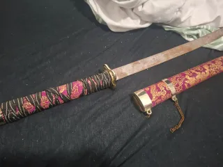 Set de katanas decorativas con un diseño elegante. - Fundas con estampado floral en tonos morados y dorados. - Empuñaduras envueltas en hilo negro. - Incluye soportes de madera para exhibición.