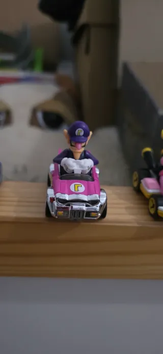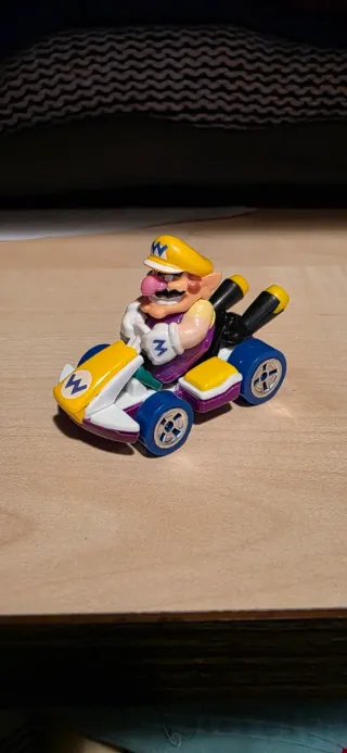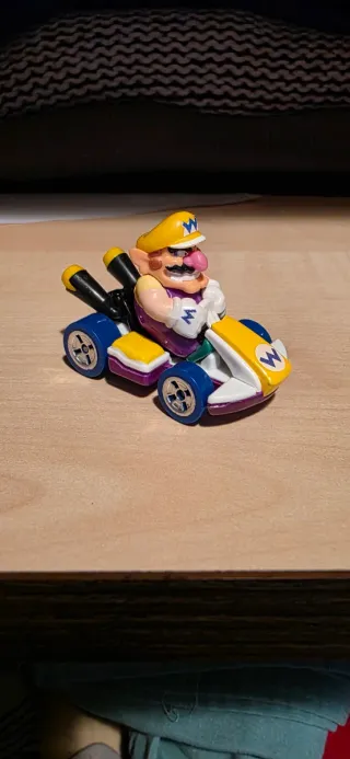 Figura de Wario en su kart de Mariokart, estilo Hot Wheels. - Kart de Wario con diseño característico. - Figura detallada de Wario. - Ruedas plateadas.
