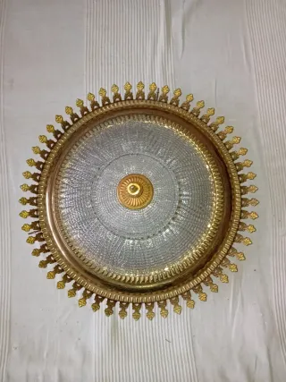 Elegante platón redondo de latón y cristal con un diseño intrincado y un acabado dorado. Signos de desgaste mínimo en el dorado por los años. - Borde de latón decorado con motivos ornamentales. - Centro de cristal con relieve texturizado. - Diámetro 44cm