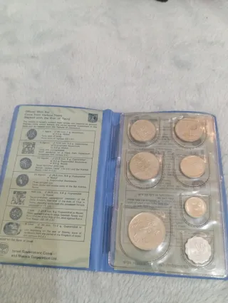 Conjunto oficial de monedas de Israel de varios años, marcadas con la Estrella de David. Incluye siete monedas. - Monedas de 1 Agorá, 5 Agorá, 10 Agorá, 25 Agorá, 1/2 Lira, 1 Lira y 5 Liras. - Materiales variados como cuproníquel, níquel y aluminio. - Diseños inspirados en la historia y cultura de Israel, como la Menorá, granadas y el sello de Shema. - Emitidas por el Banco de Israel y la Israel Government Coins and Medals Corporation Ltd.