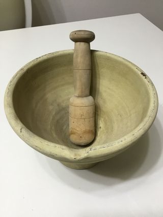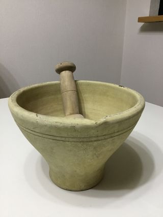 Este mortero antiguo está hecho de barro y viene con su mano. Ronda entre los 70 a 75años de antigüedad. Proviene de la zona de “barros” en Badajoz. - Material: Barro - Incluye mano de madera - Medidas: 18,5 cm x 18,5 cm x 14 cm alto