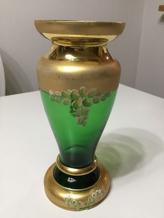Elegante jarrón vintage de finales de los años 60. Su diseño combina el verde vibrante del cristal con detalles dorados. - Base y cuello con acabado dorado. - Decoración floral pintada a mano. - Forma cónica estilizada. - Medidas: 10 cm x 10 cm x 22 cm de alto