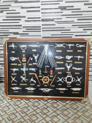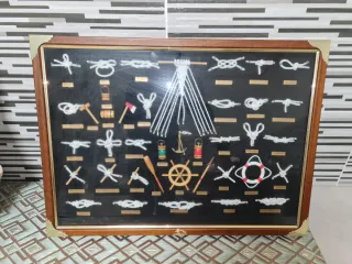 Cuadro decorativo con una variedad de nudos marineros. Ideal para amantes del mar y la navegación. - Exhibición de diferentes tipos de nudos. - Marco de madera con detalles dorados.