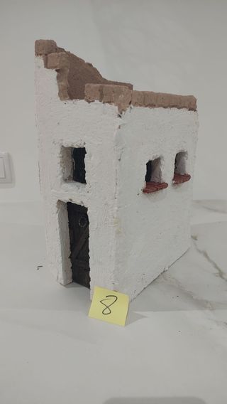 Casa decorativa para Belén o Navidad, con un diseño de torre rústica. - Estructura de paredes blancas con detalles de ladrillo. - Techo con acabado de barro y aspecto desgastado. - Puerta de madera oscura con detalles. - Ventanas con pequeños alféizares. PRIMER PREMIO de la Asociación de belenistas de Elche en la categoría de belenes populares 2024. Casas artesanales HECHAS A MANO para Belenes, de distintas formas, tamaños y motivos. Material: cartón y corcho de poliestireno. Para figuras de tamaño máximo 13 cm. Tengo disponibles 14 casas diferentes, visita mi perfil.