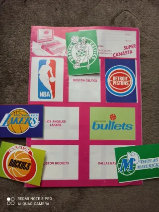 Álbum de cromos NBA Súper Canasta. Incluye todos los escudos de todos los equipos de la NBA. Algunos están aún sin pegar. Jugadores sólo tengo 2 que están pegados que son Michael jordan y Julius Erving. Michael Jordan esta un poco arrugado Este álbum de súper canasta tiene que ser de los años 90 - Incluye pegatinas de equipos como Boston Celtics, Detroit Pistons, Los Angeles Lakers, Houston Rockets y DallasMavericks....