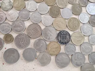 Conjunto de monedas antiguas, ideal para coleccionistas. - Una moneda de plata de 100 pesetas. - Varias monedas de 25 céntimos.