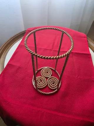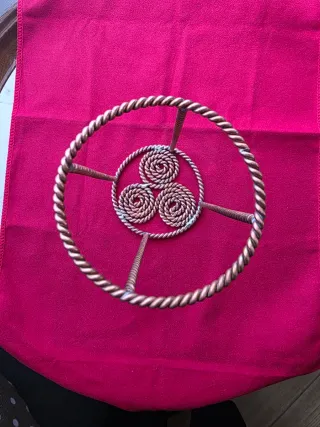 Diseño Artesanal con Trisquel Soporte artesanal hecho a mano con alambre de cobre puro de 2,5 mm. - Incluye dos anillos tensores y un elegante diseño celta Trisquelion en la base. - Ideal como pieza decorativa, para botellas, rituales, rincones espirituales o para amantes del estilo celta y el cobre. - Único y hecho a mano.