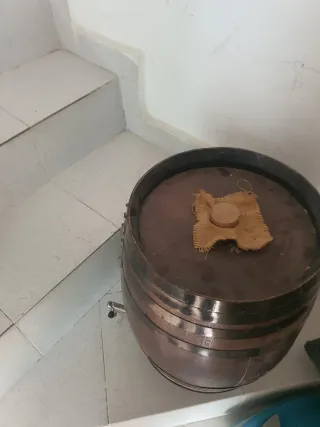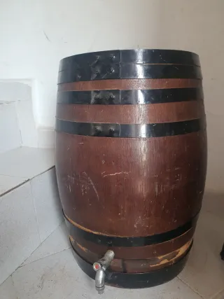 Barril decorativo con estructura de madera y detalles de hierro. - Diseño rústico. - Aros metálicos negros. - Grifo dispensador.