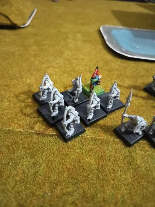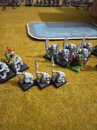 Figuras de Orcos y Goblins para Warhammer. - Figuras de plástico. Oldhammer 6 orcos con espadas y escudos. 3 goblins con lanzas. 8 arqueros orcos 7 arqueros goblin 1 orco negro 3 minis pintadas color base
