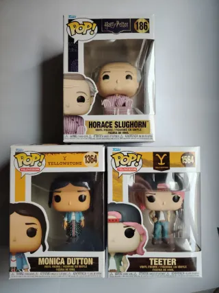 Colección de figuras Funko Pop! de vinilo. - Horace Slughorn (Harry Potter) #186 - Monica Dutton (Yellowstone) #1364 - Teeter (Yellowstone) #1564 Cajas de Teeter y Mónica NO perfectas