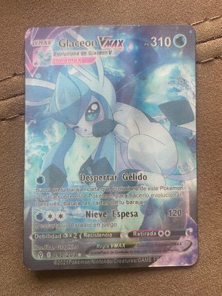 Carta Pokémon de Glaceon VMAX. - Ilustración de 6ban Graphics. - Número de carta 040/203. - Incluye la habilidad Nieve Espesa y el ataque Despertar Gélido. - PS: 310.