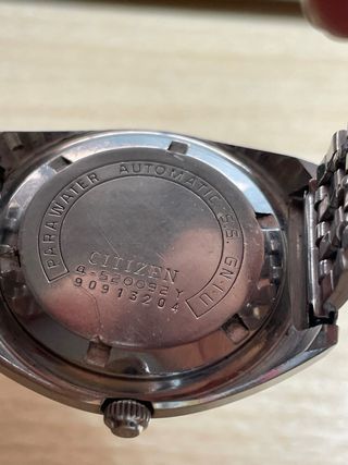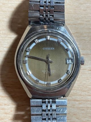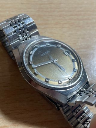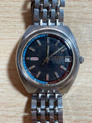 Citizen Crystal Seven Automatic Vintage Reloj Citizen Crystal Seven original vintage, automático y en buen estado de funcionamiento. Un clásico japonés de los años 70, muy valorado por su fiabilidad y diseño atemporal. • Movimiento automático Citizen, funciona correctamente y mantiene la hora • Día y fecha con cambio rápido (funcionan ambos) • Caja de acero inoxidable, aprox. 37 mm (sin corona) • Brazalete de acero (no original, pero de buena calidad) • Resistente al agua para uso diario ligero (por antigüedad no se garantiza estanqueidad) Estado: El reloj presenta pátina y ligeros signos de uso, acordes a su edad.