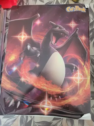 Álbum para coleccionar cartas Pokémon con un diseño de Charizard en llamas. - Portada con arte de Charizard. - Diseño inspirado en el espacio y fuego.