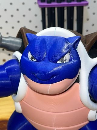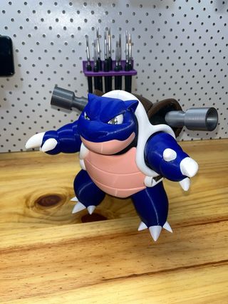 Figura decorativa de Blastoise, personaje de Pokémon, impresa en PLA. - Color azul y blanco. - Detalle de cañones en los brazos.