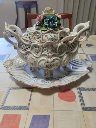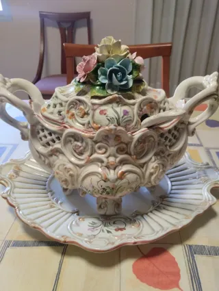 Elegante sopera antigua de porcelana, con un diseño intrincado y decorada con flores. - Pieza de colección. - Incluye tapa y base. - Adornada con detalles florales pintados y en relieve.