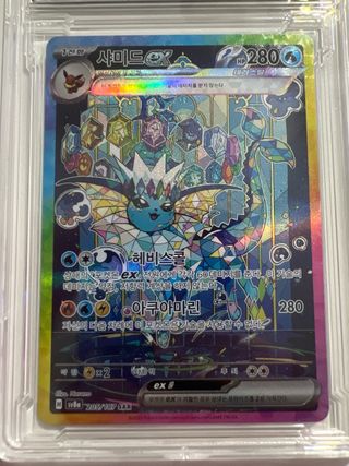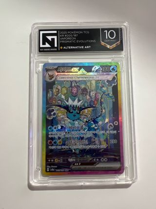 Carta Pokémon Vaporeon EX, con una calificación NGU de 10 Gem Mint. Edición coreana. - Modelo: Vaporeon EX KR #205/187 - Serie: Prismatic Evolutions - Arte: Alternative Art - Calificación: 10 Gem Mint por NGU (Next Grading Universe)