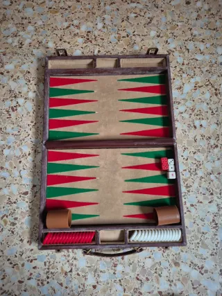 Juego de mesa Backgammon de estilo antiguo. - Tablero con diseño clásico de triángulos rojos y verdes. - Incluye cubiletes y fichas. - Dos dados para jugar.