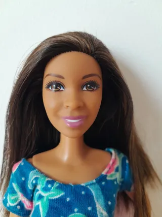 Muñeca Barbie veterinaria con vestido original de la boutique de 1995. - Vestido azul con estampado floral. - Detalle de tul rosa en la cintura. - Zapatos morados.