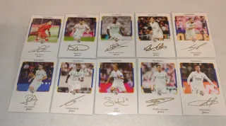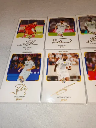 Colección de cromos de jugadores del Real Madrid con sus firmas daka top audience real Madrid - Incluye varios jugadores del equipo. Iker Casillas Brahin Díaz Aurelin tchouameni Ronaldo Dani Carvajal Raul asencio Antonio ridiger Guti Federico Valverde Edén hazard - Ideal para coleccionistas del Real Madrid. Precio por todos no separo lote