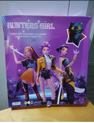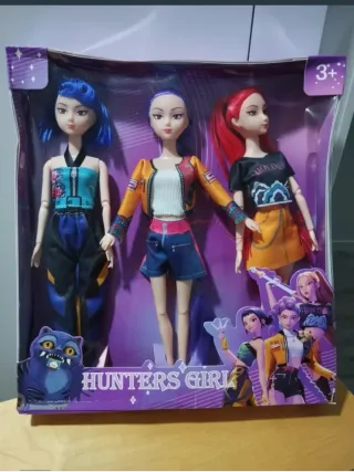 Set de 3 muñecas estilo K-Pop de la marca Hunters Girl.。 - Muñecas con cabello de colores (azul, morado, rojo). - Ropa moderna y detallada. - Incluye accesorios y arte promocional en el empaque. La caja está un poco dañada