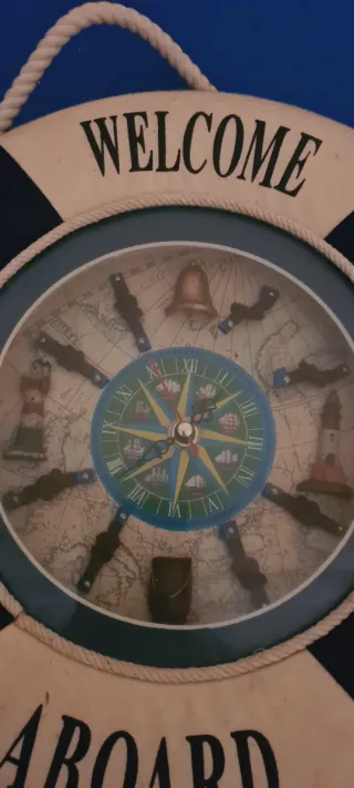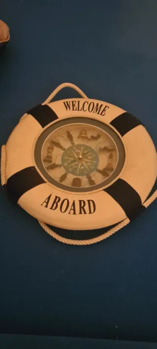 Decoración náutica con forma de timón y salvavidas. Incluye una brújula en el centro. - Diseño Welcome Aboard. - Brújula decorativa. - Aros en blanco y negro.