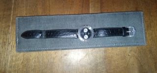 Reloj con correa de cuero negra y detalles en la esfera. - Correa con grabado 'MERCEDES-BENZ'. - Esfera con números en naranja y logo de Mercedes. - Correa con grabado 'TRUC KLUB'. Sin pila