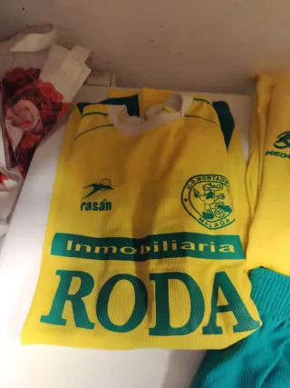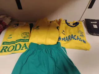 Conjunto de ropa deportiva del equipo U.D. Mortadelo, Pantaloneta y chaqueta talla M Camisetas talla XL - Camiseta amarilla con detalles azules y logo. - Chaqueta deportiva amarilla. - Pantalón corto verde.