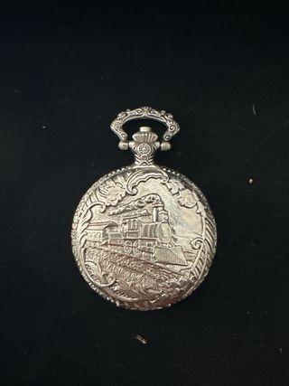 Elegante reloj de bolsillo con un diseño grabado de un tren. - Diseño detallado de locomotora. - Acabado metálico plateado. - Cierre de seguridad.