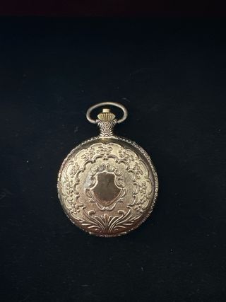 Elegante reloj de bolsillo Suhler con un diseño clásico y detallado. - Caja metálica con grabados florales. - Escudo central en relieve. - Corona y asa decoradas.