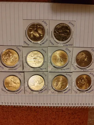 Conjunto de monedas de 5 euros de Eslovaquia. - Diseños variados con motivos nacionales. - Años disponibles: 2021, 2022, 2023, 2024, 2025. - Cada moneda está protegida individualmente. Se vende lote completo,NO POR SEPARADO