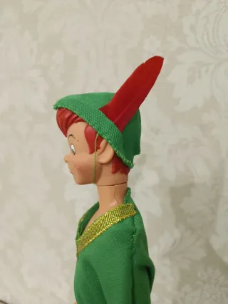 Muñeco del personaje Peter Pan de Disney. Viste su icónico traje verde. - Traje verde con detalles dorados , hecho a mano. - Gorro verde con pluma roja , hecho a mano . - Zapatos amarillos , hechos a mano .