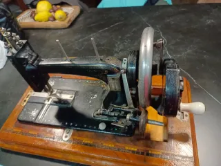 Máquina de coser antigua con base de madera. - Diseño clásico en color negro. - Detalles ornamentales dorados. - Base de madera con incrustaciones.
