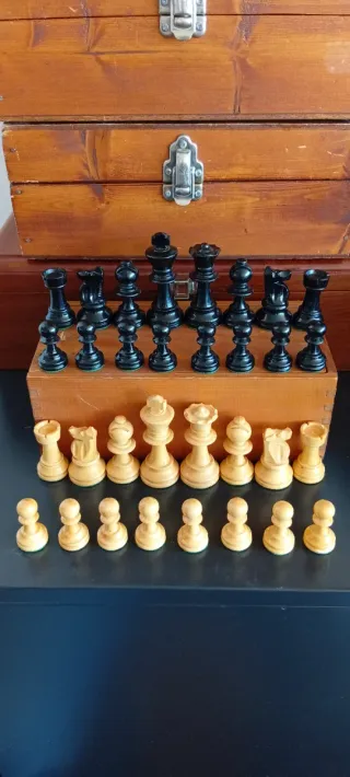Conjunto de piezas de ajedrez antiguas, fabricadas en madera y con plomado. - Piezas de ajedrez Lardy. - Material: Madera. - Plomadas para mayor estabilidad. - Con fieltro - Incluye caja para almacenamiento Medidas del rey: Alto 7cm base 2,8cm