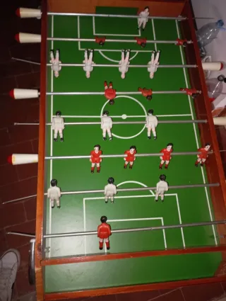 Futbolín clásico de mesa, perfecto para partidas divertidas. - Diseño de madera. - Figuras de jugadores de plástico.