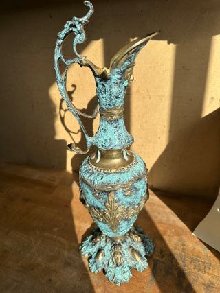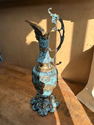 Elegante jarrón de estilo antiguo, con un diseño muy decorativo que evoca épocas pasadas. Su acabado le confiere un aspecto único y llamativo. - Fabricado en metal con detalles en bronce. - Tonos dorados y verdosos que resaltan su ornamentación. - Base ornamentada con motivos clásicos. Altura 47 cm, 3,6 Kg