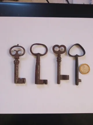 Conjunto de cuatro llaves antiguas con un diseño clásico. - Fabricadas en metal con acabado oxidado. - Cada llave presenta un diseño de cabeza y paletón único. - Ideales para coleccionistas o decoración vintage.