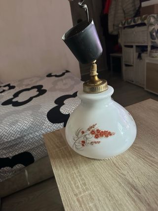 Lámpara de techo antigua con un diseño elegante y decorativo. - Base y detalles en acabado dorado. - Cuerpo principal de cristal blanco. - Adornada con un delicado estampado floral.